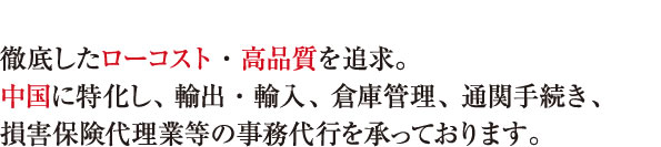 「中国全土から安く、早く輸入したい」、「少量を安く輸(出)入したい」、「日本で知られていない中国工場を紹介してほしい」など、当社は中国と日本間の輸出・輸入、納品先への配送、通関手続き等の事務代行、倉庫管理等、中国輸入・輸出業務をトータルにご提案いたします。